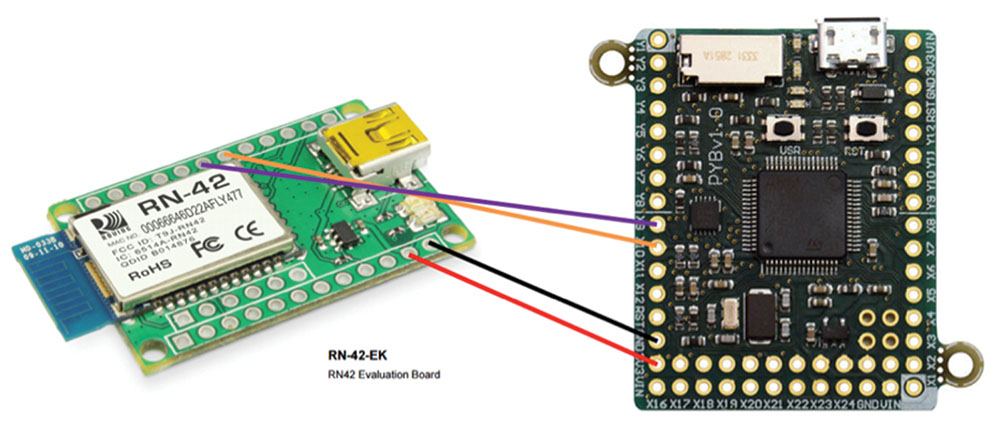 Zajemanje podatkov tipala, ki se jih nato ne uporabi, ni zelo uporaben prikaz uporabnosti MicroPythona za razvojno ekipo. Številne razvojne ekipe se soočajo s tehničnimi izzivi pri povezovanju tipal z internetom ali lokalnim središčem tipal prek Bluetootha. Bluetooth lahko projektu preprosto dodate z uporabo modula RN-42. Modul RN-42 lahko nastavite tako, da mikrokontroler preprosto pošilja podatke na UART, ki naj bi se poslali prek Bluetootha, modul RN-42 pa upravlja s celotnim skladom Bluetooth Napaka: vira sklicevanja ni mogoče najti(slika 4).