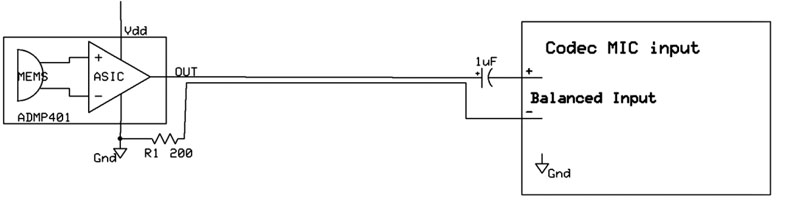 Kritična lastnost uravnoteženega voda je, da imata oba vodnika enaki impedanci v primerjavi z maso. Ta pogoj je mogoče ponoviti z uporabo referenčnega prevodnika, ki se zaključi z ustrezno impedanco. Če vzamemo za primer MEMS Mikrofon Analog Devices ADMP401, ima izhodno impedanco 200 Ohmov. Uravnoteženo pot signala lahko ustvarimo z dodajanjem 200 Ohmskega upora v točki, kjer je mikrofon priključen na referenčno maso in potem vodimo ta signal po uravnoteženem vodu vzporedno z osnovnim signalom (glej sliko 1). Čeprav ne ustvarja ravno idealnih pogojev za odlično uravnoteženo linijo zaradi tolerance vrednosti uporov in drugih dejavnikov, je bilo za to poceni vezje dokazano, da zmanjšuje nivo RFI motenj v aplikacijah, ki jih srečujemo v resničnem življenju.