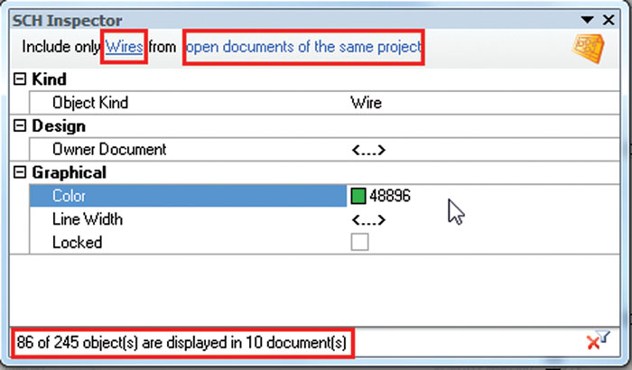 Če bi želeli modificirati opcije linij, bomo uporabili „SCH Inspector“ panel. Najdemo ga v: „View » Workspace Panel » SCH » SCH Inspector“. SCH Inspector nastavite tako, da bo vseboval samo povezave odprtih dokumentov, ki so v projektu. Število dokumentov in objektov lahko preverite na dnu dialoga „SCH Inspector“, slika 2.