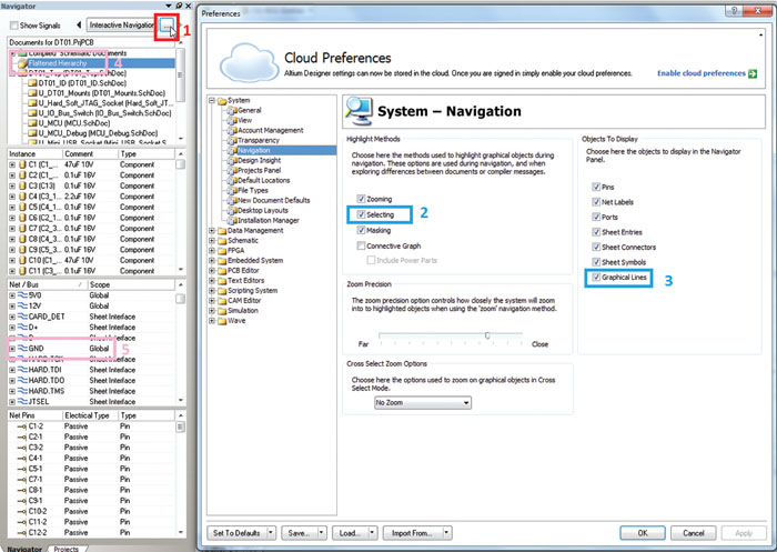 Navigacijski panel in njegove lastnosti so prikazane na sliki 1. Najprej nastavite obnašanje navigacijskega panela. To storite tako, da pritisnete tipko „…“ (označeno s št. 1 na sliki), s katero odpremo okno za nastavitve Navigatorja. V nastavitvah izbire „Highlight Methods“ izberite opcijo „Selecting“, v opciji „Objects to display“ pa izberite „Graphical Lines“ (3). S to izbiro smo zagotovili, da bodo poudarjene vse povezave, kadar bomo izbrali določen NET v navigacijskem panelu. Ko končate kliknite „OK“, da zaprete dialog.