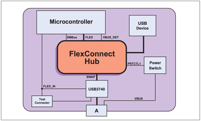 Da bi se temu problemu izognili, je Microchip presenetil z idejo FlexConnect, ki je edinstvena funkcija Microchip-ovih USB vozlišč in ki je na voljo na napravah USB253x, USB3613, USB3813 in USB46x4. Uporaba FlexConnect omogoča vozlišču dinamično spreminjanje fizičnih priključkov USB vrat, ki zato lahko delujejo kot vrata s podporo toku podatkov v obe smeri, tako da lahko oblikovalec razvija nek proizvod, ki deluje kot USB gostitelj in kot priključena naprava, ne da bi bila za to potrebna dva posebna priključka. Sistem s takšno sposobnostjo na enem samem priključku je mogoče razširiti tudi na druge priključene naprave prek vozlišča.