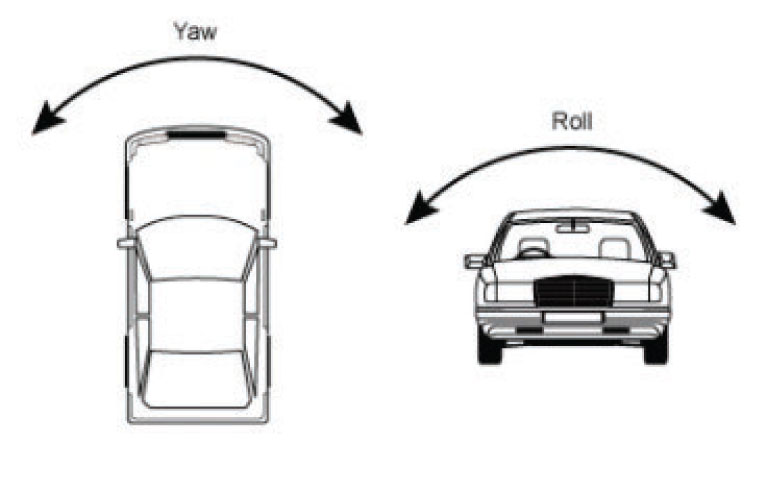 Kot je prikazano na sliki 1, je odklon rotacijsko gibanje okrog navpične osi vozila. Senzor stopnje odklona je žiroskopski senzor, ki meri kotno hitrost gibanja v smeri odklona vozila. Prevračanje je rotacijsko gibanje okoli vzdolžne osi vozila (spredaj-zadaj). Senzor prevračanja je žiroskopski senzor, ki meri kotno hitrost gibanja vozila v smeri prevračanja.