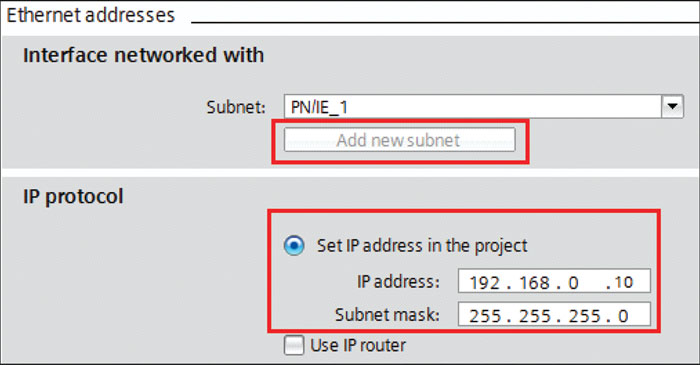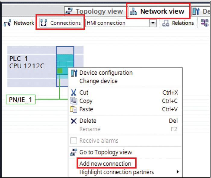 Slike niV programskem orodju Step7 V11 najprej izberemo poljubni krmilnik serije S7-1200, mu določimo IP naslov in kliknemo ‘Add new subnet’, slika 1. Nato izberemo ‘Network’ pogled, pod povezavami z desnim klikom na krmilnik dodamo novo povezavo, slika 2.