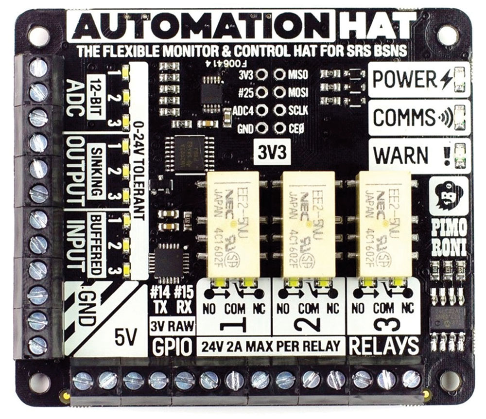 HAT za avtomatizacijo podjetja Pimoroni, ki je zasnovan posebej za nadzor sistemov za avtomatizacijo, združuje več kanalov V/I, vključno z analognimi in digitalnimi vhodi, napajanimi izhodi in krmilniki relejev. Poleg možnosti napajanja 24-voltnih enot (V) kanali V/I zagotavljajo dokaj zmogljivo vhodno in izhodno medpomnjenje. Relejni izhodi na primer napajajo do 2 ampera (A), kar je dovolj za poganjanje 24-voltnih nizkonapetostnih delov, na primer magnetnega ventila Crouzet 81 546 001.