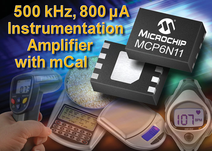 Microchip je najavil svoj prvi instrumentacijski ojačevalnik MCP6N11. Novi instrumentacijski ojačevalnik ponuja edinstveno Microchip tehnologijo mCal, kar je vezje za umerjanje na čipu, ki omogoča nizko začetno izravnavo napetosti in sistem za krmiljenje drsenja izravnave, zaradi česar lahko dosežemo večjo natančnost s časom in temperaturo. CMOS procesna tehnologija nizke porabe MCP6N11 omogoča nizko porabo, hkrati pa zagotavlja izdelku pasovno širino 500 kHz. Strojna oprema s priključkom za izklop (shutdown) celotnega vezja pripomore k še večjemu prihranku energije. Vezje deluje pri napetosti 1,8V in omogoča, da dve 1,5V bateriji izpraznemo pod nivo običajne uporabe, medtem ko v okvirih napajalne napetosti zagotavlja polno vhodno-izhodno delovanje celo pri najnižji napajalni napetosti. MCP6N11 je inovativna rešitev za prilagoditev in oblikovanje signalov v merilnih instrumentih, senzorjih v izdelkih široke potrošnje ter v industrijskih in medicinskih aplikacijah, ki zahtevajo kombinacijo visoke zmogljivosti pri konkurenčnih cenah.
