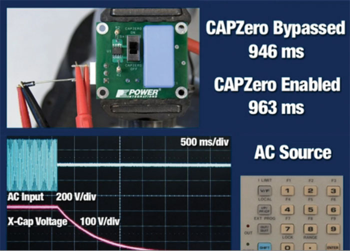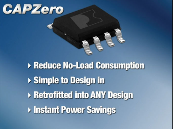 Enostavno vezje z dvema priključkoma, ki se samo napaja, samodejno in varno odpravlja izgube energije v EMI filtrih napajalnikov. Power Integrations je izdelal integrirano vezje CAPZero®, krmilnik praznjenja X-kondenzatorjev, ki ustreza novemu IEC 62369 standardu za televizorje in IT opremo.