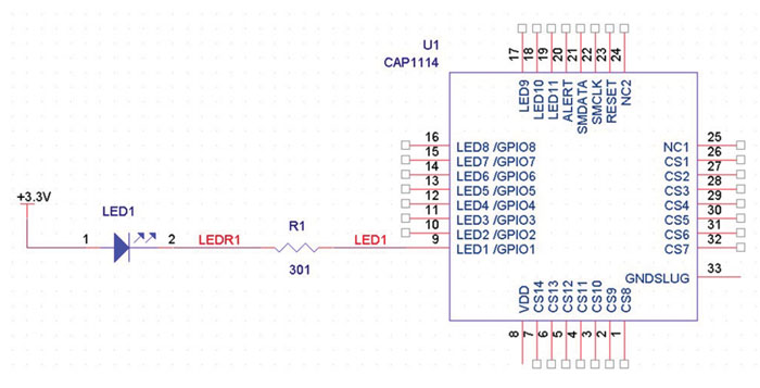 Ker pa je lahko LED vgrajena tudi v nasprotni konfiguraciji, ima CAP1114 tudi možnost določanja logične polarnosti, kot je razvidno iz primera na sliki 2, kjer je vir toka RightTouch integrirano vezje.