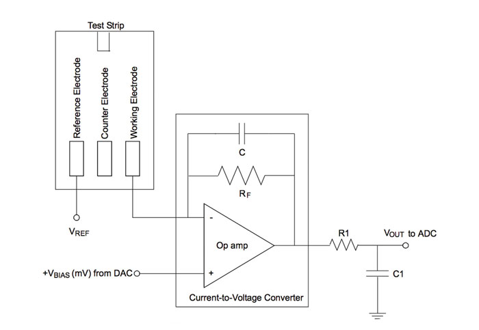 Testni trak tvori glavni biokemični senzor, s katerim opazujemo vzorec raztopine in vsebuje tri elektrode. Elektroni nastajajo v delovni elektrodi med kemijsko reakcijo. Ta elektroda je povezana na vhod ojačevalnika, ki je obenem tokovno-napetostni pretvornik. Za pospešitev želene kemijske reakcije je potrebno na referenčni elektrodi vzdrževati konstantno napetosti glede na delovno elektrodo. Tretja elektroda se imenuje števčna elektroda, prek nje dovajamo tok delovni elektrodi. Večina modelov merilnikov glukoze uporablja le referenco in delovne elektrode.