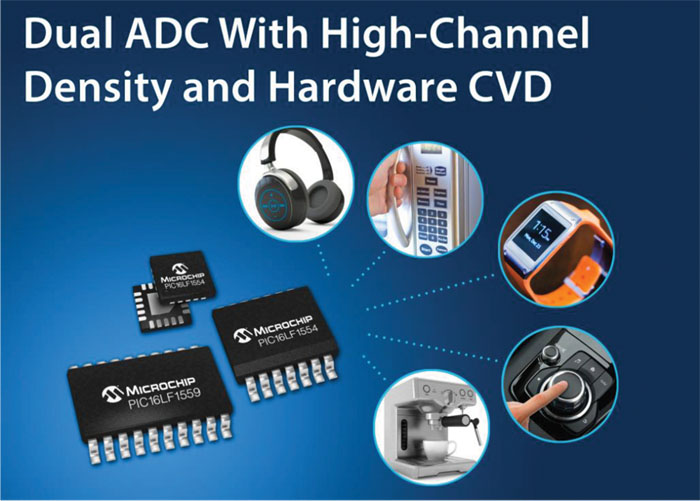 Microchip predstavlja nove člane v svoji družini PIC12 / 16LF155X 8-bitnih mikrokontrolerjev in sicer PIC16LF1554 in PIC16LF1559 (PIC16LF1554 / 9). PIC16LF1554 / 9 vsebuje dva neodvisna 10-bitna analogno-digitalna pretvornika s hitrostjo vzorčenja 100k vzorcev na sekundo in stojno izveden kapacitivni delilnik napetosti (CVD) kot podpora pri zaznavanju kapacitivnega dotika. Ta edinstvena konfiguracija AD pretvornikov omogoča učinkovitejše zajemanje podatkov s senzorjev in s pomočjo naprednih tehnik zaznavanja dotika zaznavati dotik celo v izjemno hrupnem okolju, uporablja se za aplikacije z nizko porabo, za matrične tipkovnice in vodoodporne izdelke.