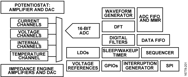 AD5940 je čip z najmanjšo porabo, najbolj zmogljiv impedančni in elektrokemijski vhodni del z inteligentnim avtonomnim krmiljenjem. Analogni vhodni del združuje vrhunsko integracijo in zmogljivost za krmiljenje potenciostatov in impedančnih elektrokemijskih senzorjev. Potenciostat na čipu omogoča vrsto standardnih elektrokemijskih merilnih tehnik, kot so amperometrične, voltametrične ali impedančne meritve.