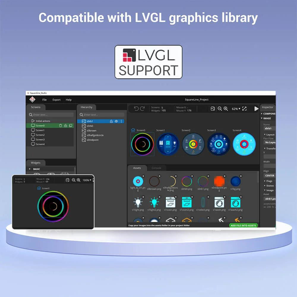 ESP32 Display je združljiv z grafično knjižnico LVGL in podpira več razvojnih okolij.
