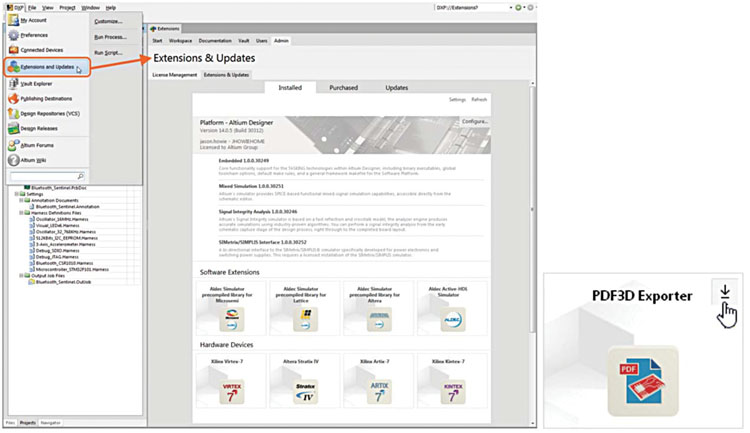 Opcijo za izvoz PDF 3D lahko v Altium Designerju omogočite z namestitvijo modula »PDF 3D exporter« iz DXP/Extensions and Updates. Kliknite na ikono »PDF3D Exporter«, za dokončanje namestitve znova zaženite Altium Designer. Ko je modul nameščen, se bo pojavil v DXP / Extensions and Updates v zavihku »Installed«.