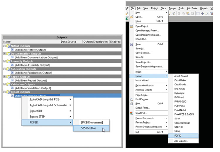 Slike niPotem, ko je razširitev za PCB3D PDF z interaktivnim 3D pogledom nameščena, je mogoče PDF izvoziti bodisi iz menija »File« ali pa iz »Output Job-a”. Za izvoz 3D PDF datoteke neposredno iz »File« menija odprite v Altium Designerju PCB design kot aktivni dokument in iz File/Export izberite PDF3D. Izvoz 3D PDF-ja je možen tudi iz datoteke »Output Job« s tem, da dodamo nov izvoz PDF3D.