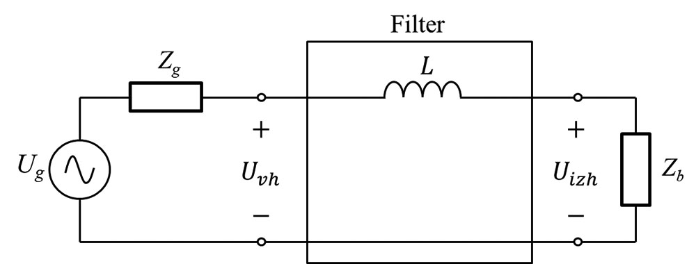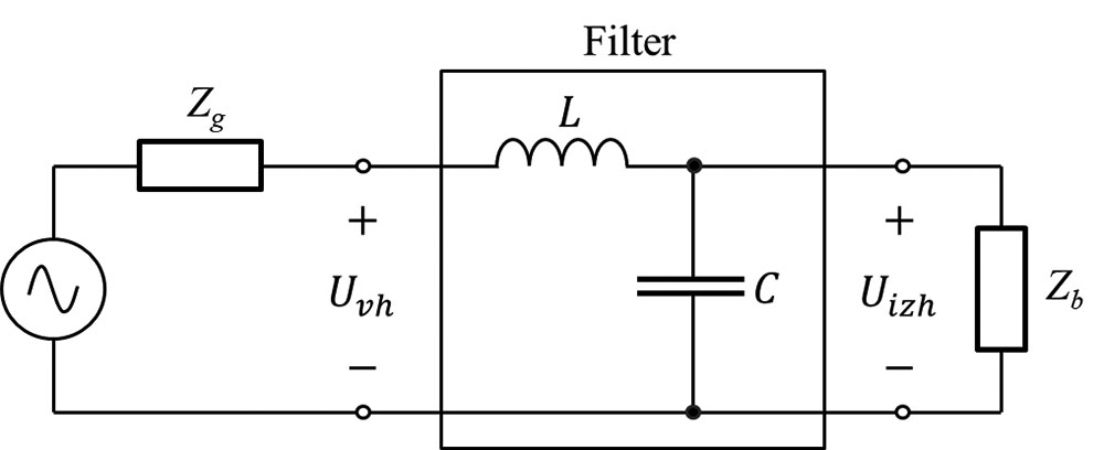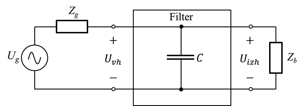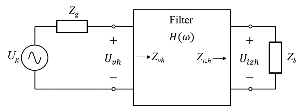 Vidimo lahko, da bo dušenje signala generatorja veliko pri visoki impedanci generatorja Zg in nizki impedanci bremena – žrtve Zb. Ko pa vstavimo med njiju filter, le ta spremeni razmere v vezju s svojo vhodno in izhodno impedanco. In tako dobimo dva impedančna delilnika, ki določita vhodno napetost filtra Uvh in prek prevajalne funkcije filtra H(ω) tudi izhodno napetost Uizh, ki je napetost na bremenu – žrtvi Zb.