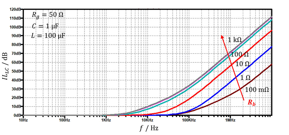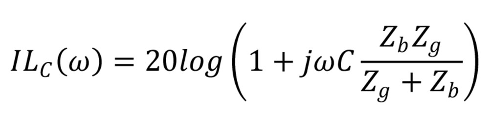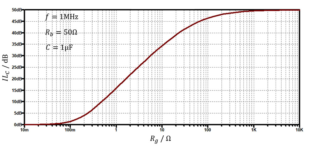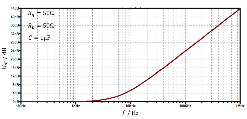 Hitro lahko vidimo, da je vstavitveno dušenje poleg impedance kondenzatorja ZC=1/jωC odvisno tudi od obeh okoliških impedanc. Če zaradi enostavnosti privzamemo, da sta impedanci realni (Zg=Rg in Zb=Rb), ILC seveda narašča s frekvenco s strmino 20 dB/dekado v področju, kjer je celoten izraz v oklepaju veliko večji od 1. To je za primer kondenzatorja s kapacitivnostjo 1μF v standardnem 50 ohmskem sistemu (Rg=Rb=50Ω)kar kaže slika 3. A četudi se nahajamo v frekvenčnem območju, kjer bi pričakovali visoko vstavitveno dušenje ILC, to velja le, kadar je Rg ≫ Rb. V nasprotnem primeru, ko je Rg ≪ Rb, je vstavitveno dušenje lahko tudi zanemarljivo majhno in se približa 0 dB, kar lepo prikazuje slika 4. Če poenostavimo: lahko se vam zgodi, da vstavitev kondenzatorja ne bo imela nobenega učinka.