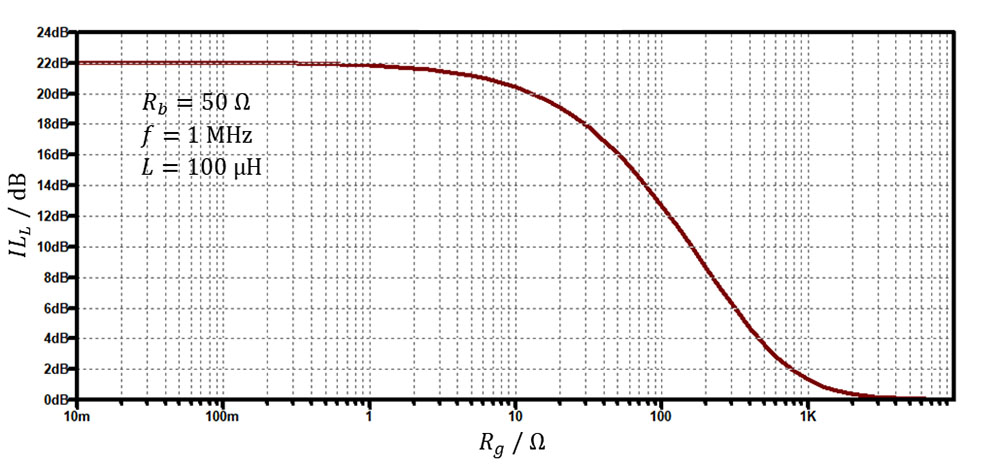 Ko pogledamo odvisnost ILL od impedance (upornosti) izvora motnje Rg, je potek obraten kot pri kondenzatorju. Vstavitveno dušenje je veliko, če velja ωL ≫ Zg+Zb, kar se ponavadi zgodi z višanjem frekvence. A tudi pri visokih frekvencah je lahko ILL minimalno, če sta ena ali obe impedanci visoki. To se iz slike 6 lepo vidi, ko ILL pade proti 0 dB, ko povečujemo serijsko upornost vira motnje Rg.