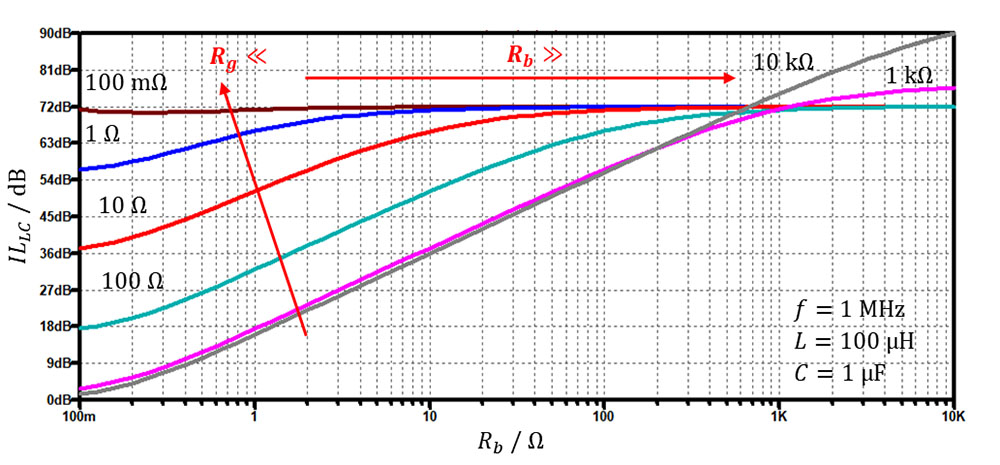Pri katerih impedancah vira in bremena je ta LC filter torej najbolj učinkovit? Če sledimo receptu o neprilagojenosti, potem je največja ILLC v primeru, ko imamo nizko impedanco vira motnje Rg (visoka vhodna impedanca tuljave) in visoko impedanco bremena – žrtve Rb (nizka izhodna impedanca kondenzatorja), kar lepo prikazuje slika 9.