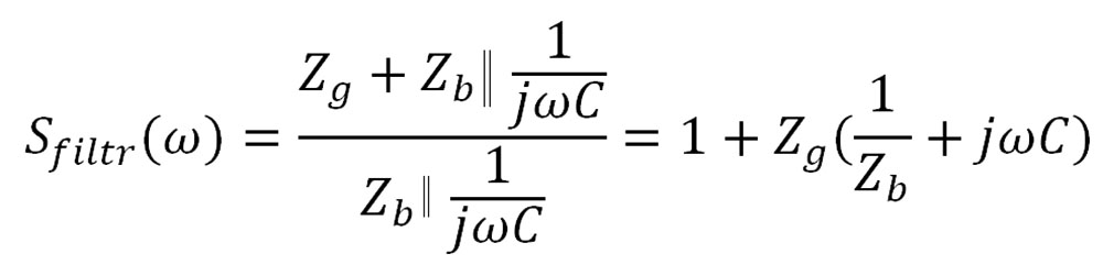 Poglejmo si en primer najenostavnejšega filtra, ki ga sestavlja zgolj en kondenzator C. Ta je vezan vzporedno z impedanco bremena – žrtve Zb, ki v kombinaciji z impedanco izvora Zg predstavlja nizkofrekvenčno-prepustni filter. Vsakemu študent prvega letnika, ki je poslušal Osnove elektrotehnike II je hitro jasno, da je dušenje novega vezja lahko izračuna kot, glej Formula 2.