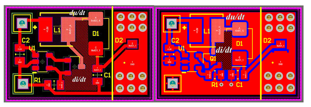 Poglejmo sedaj dve rešitvi načrta tiskanega vezja, levo slaba in desno boljša. Boljša izvedba ima zmanjšano stikalno vozlišče du/dt in minimalno površino tokovne zanke di/dt. Dodatni površini mase na obeh straneh sta povezani na maso in tako omogočata najkrajše tokovne poti po masi kot tudi učinkoviti kapacitivni sklop za napetostno generirane motnje.