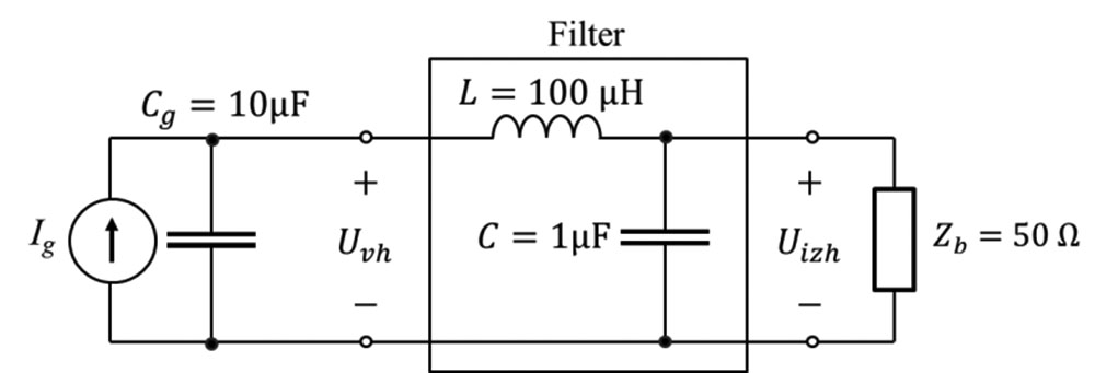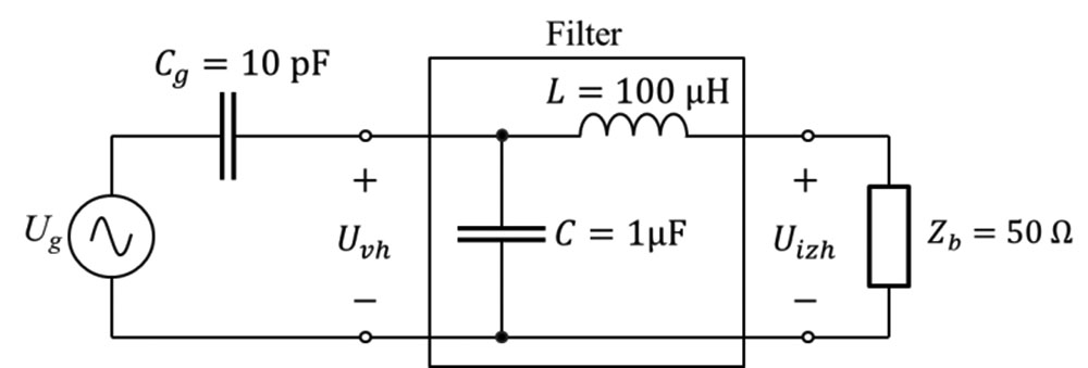 Prvi primer je kapacitivno sklapljanje motnje, kjer impedanco generatorja predstavlja kapacitivnost. V praksi tak primer srečamo npr. pri izoliranih stikalnih pretvornikih, kjer se motnja iz stikalnega tranzistorja na primarni strani transformatorja širi na sekundarno stran prek parazitne kapacitivnosti med navitjema. Kako naj ocenimo impedanco vira motnje? Ker so parazitne kapacitivnosti običajno nizke vrednosti (merijo s v pF) je v frekvenčnem področju med 150 kHz do 30 MHz, kjer se prevodne motnje v običajni elektroniki merijo, impedanca vira vedno visoka. Zato izberemo CL filter, ki ima v tem frekvenčnem področju nizko vhodno impedanco. Impedanco žrtve nastavimo na 50 Ω, saj je to standardna impedanca LISN vezja, s katerim prevodne motnje merimo. Celotna postavitev je prikazana na sliki 1. Prikazane vrednosti elementov so izbrane tipično glede na to, kar v praksi srečamo.