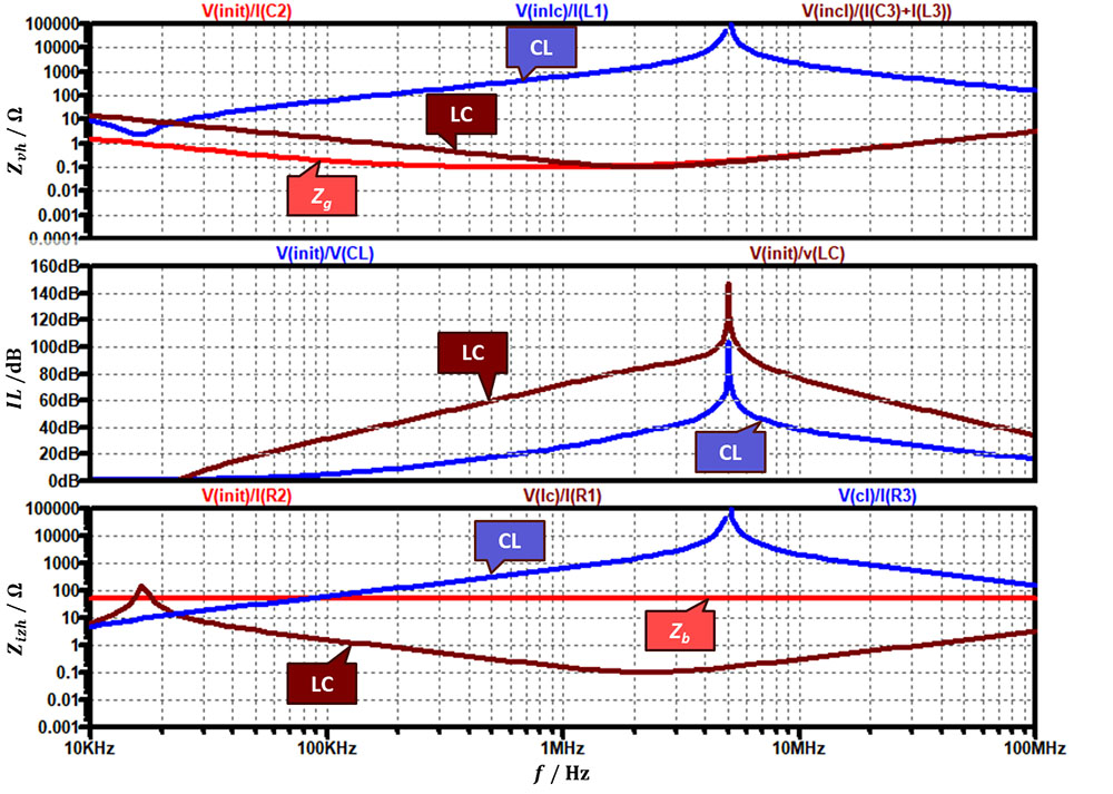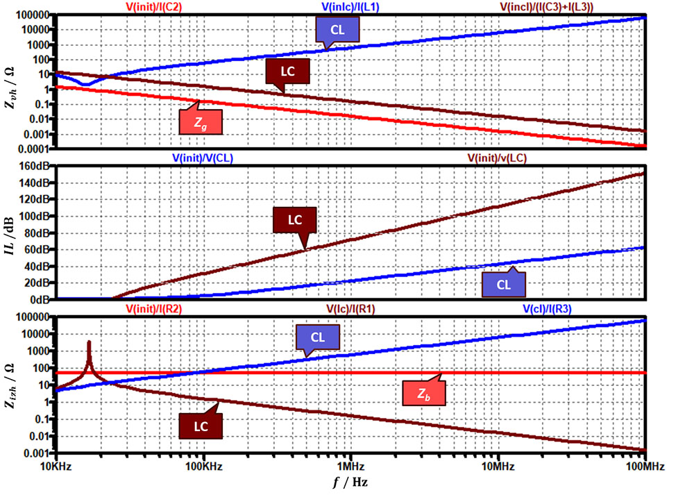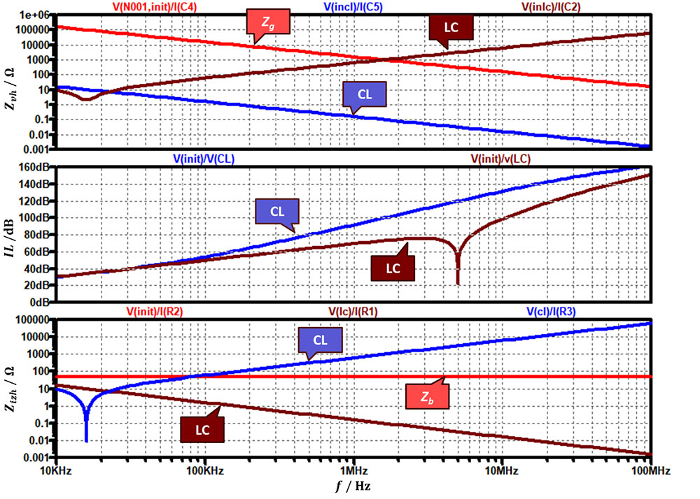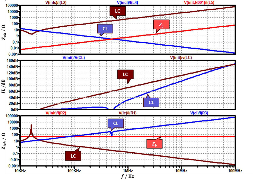 Na sliki 4 so na enak način, kot na sliki 2, prikazani poteki impedanc na vhodu (zgoraj), izhodu (spodaj) in vstavitveno dušenje (sredina). Impedanca serijske induktivnosti Lg prek katere se sklaplja motnja (rdeča črta) s frekvenco narašča, čemur sledi vhodna impedanca filtra (rjava črta). Ker je impedančna razlika velika, je tudi vstavitveno dušenje visoko (rjava črta v sredini). Podobno kot prej, je pri nizkih frekvencah učinek filtra majhen. Na grafih je za primerjavo z modro črto prikazan potek impedanc in vstavitvenega dušenja, če je izbran obraten (CL) filter. Lepo se vidi bistveno slabše vstavitveno dušenje (modra črta na sredi) v frekvenčnem področju, kjer se vhodna impedanca filtra prekriža z impedanco serijske induktivnosti Lg, prek katere se sklapljajo motnje (modra črta zgoraj).