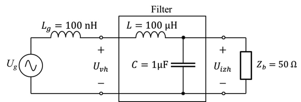 Drugi primer je vir motnje, ki se sklaplja prek serijske induktivnosti, kot kaže slika 3. Na ta način običajno modeliramo motnje, ki se prenašajo prek napajalnih linij, kjer je vir motnje lahko nek digitalni čip ali pa napajalnik, napajalna linija pa izraža neko induktivnost. Vrednost serijske induktivnosti na sliki spodaj je tipična za nekaj 10 cm dolgo povezavo na tiskanem vezju. Pri izbiri topologije filtra izberemo enako taktiko, kot prej: Serijska induktivnost Lg ima pri visokih frekvencah visoko impedanco, zato bi bilo filter smiselno začeti s kondenzatorjem, ki ima pri visokih frekvencah nizko impedanco. A potek impedance kondenzatorja je ravno nasproten poteku tuljave, zato se bosta vmes prekrižala in iz prejšnjega primera smo že ugotovili, da to prinaša vmesni upad vstavitvenega dušenja. Ker je induktivnost Lg relativno nizka, si lahko v filtru privoščimo bistveno višjo induktivnost in zato filter začnemo s tuljavo in bosta poteka vhodne impedance in impedance vira vzporedna, kar nam bo dalo konstantno impedančno neusklajenost na vhodu čez celo frekvenčno področje. Zato bom tukaj poizkusili z LC filtrom. Za lažjo primerjavo izberimo enake vrednosti elementov, kot prej.