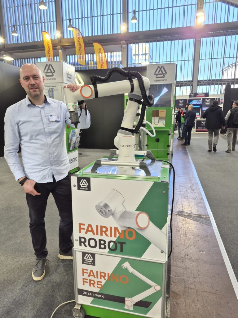 Na razstavnem prostoru podjetja Hennlich so predstavili robota z imenom Farino, ki ga imajo v ponudbi od lani oktobra. Farino je kitajski robot z 10-letno tradicijo. Robot se uvozi v Češko, kjer ga testirajo in mu dodajo CE certifikat, nakar je pripravljen za prodajo znotraj EU. Zanimiva pri tem robotu je cena, saj s ceno 5.000 € kupec že dobi delujočega robota s krmilnikom, ki ima 16 vhodov in izhodov, 5 kg nosilnosti in skoraj 1 meter dosega. Farino robot je kolaborativni oziroma sodelujoči robot, ki lahko deluje v bližini človeka, saj je njegova hitrost omejena na 250 mm/sek. Vgrajene ima tudi senzorje sile, ki robota ustavijo v primeru, ko se zadane ob oviro. Robot kot tak je sicer na voljo preko spletne prodaje, vendar ima v tem primeru robot 1 leto garancije brez podpore. Če je nakup opravljen preko podjetja Hennlich ima robot 2 leti garancije in podporo.