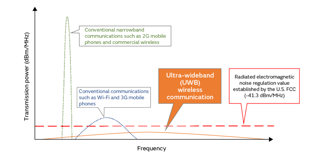 S pasovno širino najmanj 500 MHz (ali 20 % povprečne nosilne frekvence) ponuja UWB bistveno višje hitrosti prenosa od drugih tehnologij, kot sta Wi-Fi (20–320 MHz) in Bluetooth (1–2 MHz). Uporablja zelo širok frekvenčni pas (3,1–10,6 GHz) ter več prekrivajočih se kanalov. Posebnost je tudi delovanje pri zelo nizkih močeh oddajanja, blizu meje šuma, kar zmanjšuje motnje.