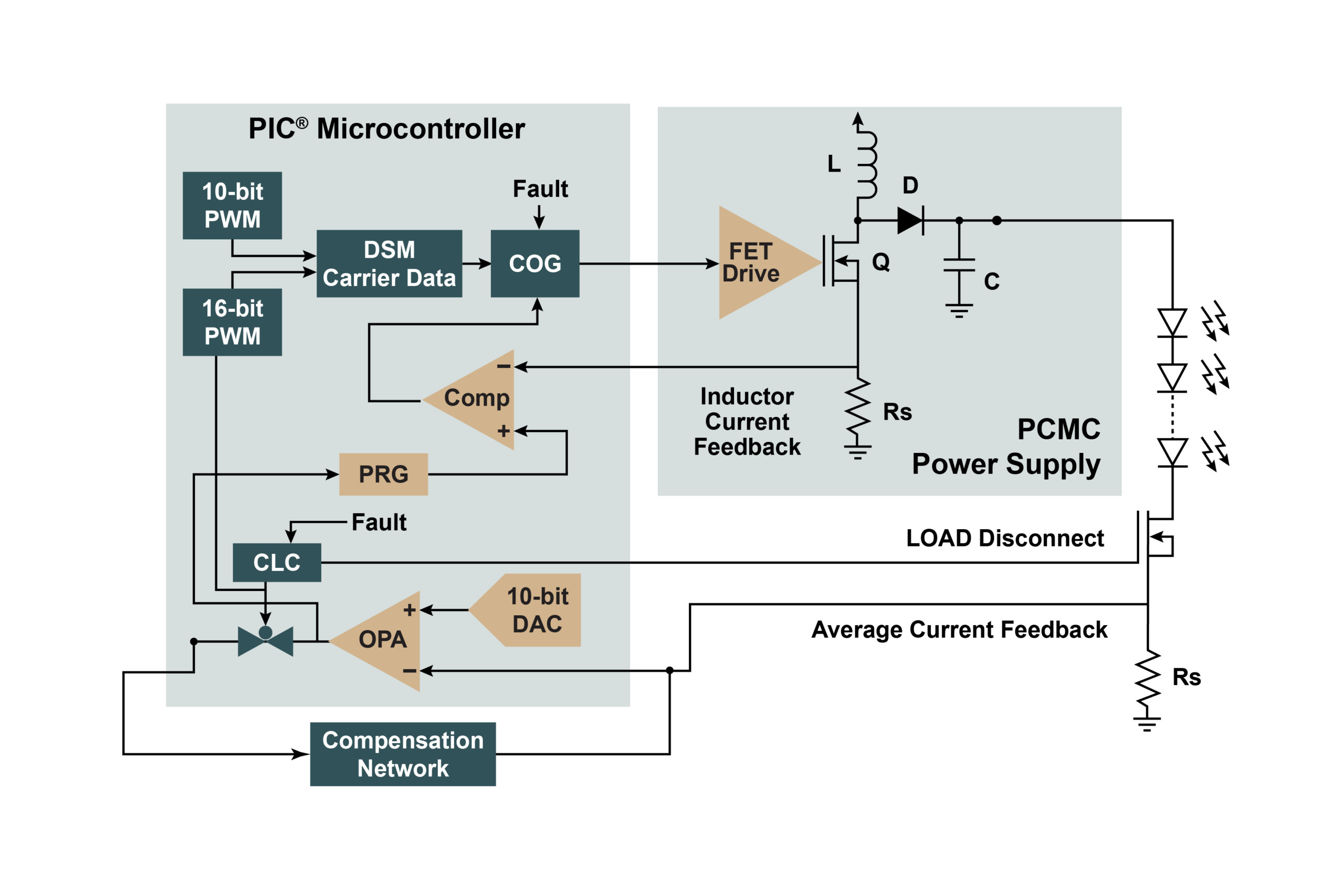 Sistemske prednosti tega pristopa niso nujno očitne. Z vidika sistemskega razvijalca bo rešitev z enim čipom pogosto izgledala kot hitrejša implementacija, poleg tega pa obstajajo tudi integrirane rešitve. Nekateri mikrokontrolerji ali digitalni signalni procesorji so popolnoma sposobni delovati kot lastni analogni vhod z uporabo integriranih komponent. Kot primer si oglejte PIC16F1769, 8-bitni mikrokontroler z 12-kanalnim 10-bitnim ADC in dvema 10-bitnima DAC. Ta naprava je bila očitno namenjena lastnemu analognemu vmesniku, del pa lahko krmili stikalno napajalno enoto za LED-pogon, pri čemer so vsi analogni krmilni signali usmerjeni neposredno v mikrokontroler. Na sliki 1 mora skozi MOSFET gonilnik teči le izhodni signal FET napajanja. Za to vezje ni bil potreben AFE, zunanje analogne diskretne komponente pa so bile minimalne.