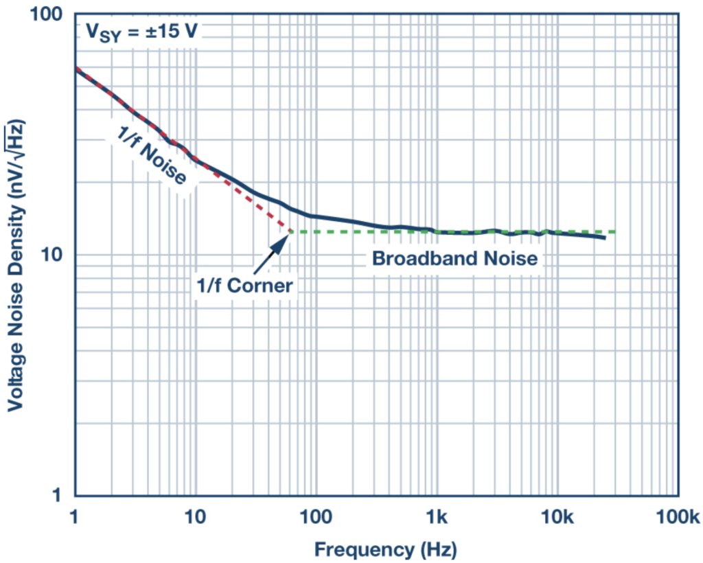 Izziv pri teh in drugih aplikacijah je zagotoviti široko pasovno širino in natančno merjenje, tudi pri nižjih frekvencah, kjer šum 1/f poslabša zmogljivost radiofrekvenčnih (RF) ADC-jev. Ta razred ADC-jev, optimiziran za zajemanje RF signalov, zagotavlja potrebno pasovno širino, vendar kaže povečan šum 1/f pri nizkih frekvencah pod svojim 1/f robom (slika 2).