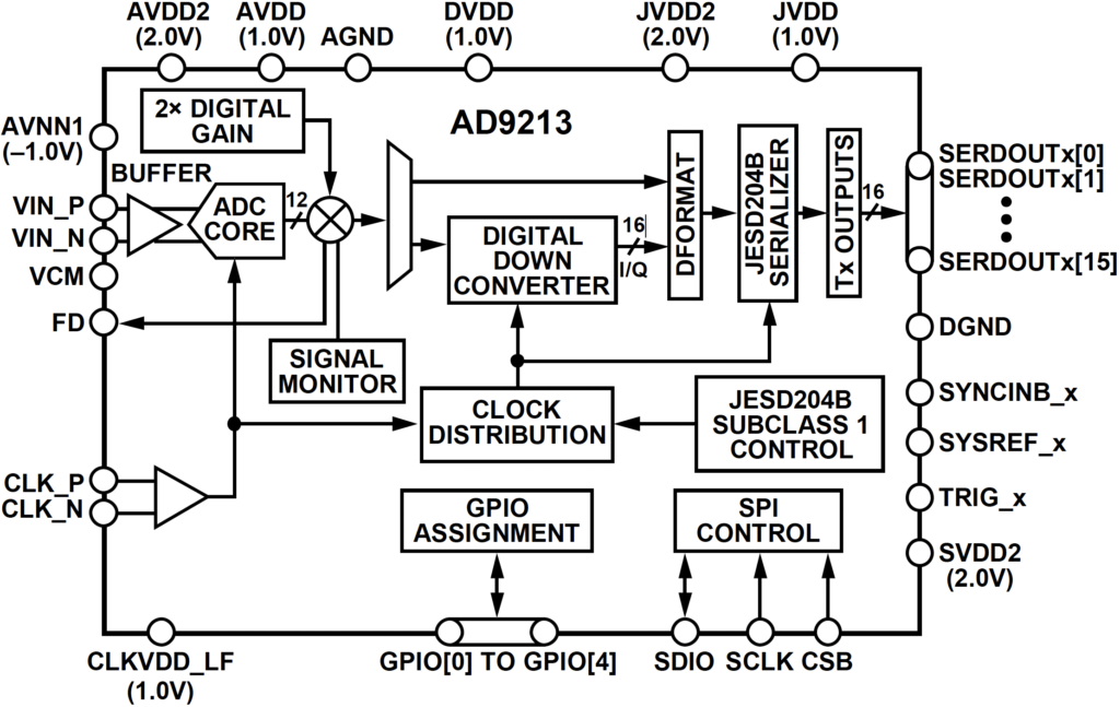 Zelo hitra pot se osredotoča na 12-bitni RF ADC AD9213 [4] podjetja Analog Devices (slika 3), ki lahko vzorči s hitrostjo 10 Gsamples/s. AD9213 je zasnovan za zagotavljanje široke trenutne pasovne širine in nizkih stopenj napak pretvorbe ter temelji na večstopenjskem, diferencialnem, pipelined ADC jedru z izhodno korekcijo napak. Da bi zagotovil maksimalno pasovno širino in deterministično zakasnitev izhoda, je v njegovo izhodno stopnjo integriran 16-pasovni JESD204B vmesnik. Poleg zagotavljanja hitrosti prenosa 16 gigabitov na sekundo (Gbit/s) izhodna stopnja uporablja standardne mehanizme JESD204B za ohranjanje deterministične zakasnitve med izhodom AD9213 in vhodom JESD204B gostiteljskega krmilnika.