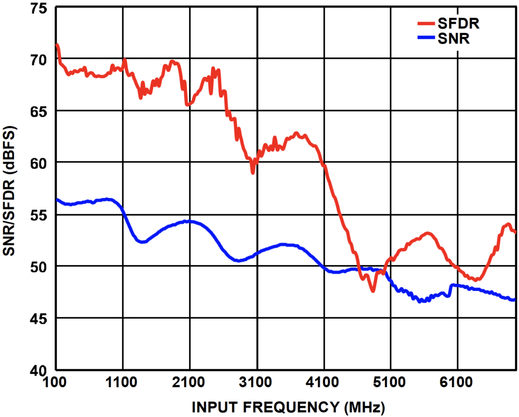 Ta ADC zagotavlja visoko dinamično zmogljivost, potrebno za natančno zajemanje visokofrekvenčnih signalov. Pri 10 Gsamples/s z vhodom 1000 MHz pri -1 decibelu glede na polno skalo (dBFS) AD9213 kaže SNR 55,8 dBFS in dinamični razpon brez motenj (SFDR) 70 dBFS (tipično). Poleg tega ta naprava ohranja odličen SNR in SFDR na vhodnih frekvencah od 100 MHz do več kot 6 GHz (slika 4), kar izpolnjuje zahteve po širokopasovni natančnosti.