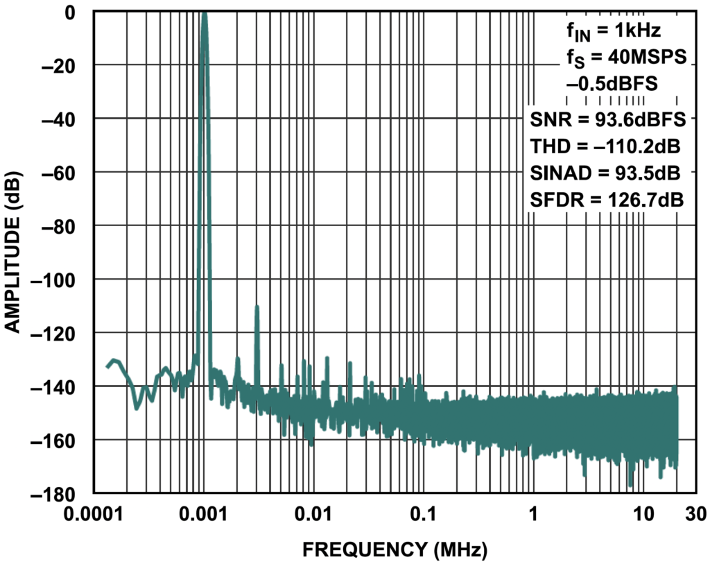 Natančna pot uporablja Analog Devices AD4080 [5], 20-bitni, 40 megavzorcev na sekundo (Msamples/s) diferencialni zaporedni aproksimacijski register (SAR) ADC z integriranim zaznavanjem dogodkov, digitalnim filtrom in dvojnim vhodnim vzorčevalnikom, ki zagotavlja natančno pretvorbo pri visokih hitrostih vzorčenja. Njegova izhodna stopnja omogoča neposreden dostop do rezultatov pretvorbe in do 16.384 vzorcev first-in-first-out (FIFO) prek vmesnika, ki podpira tako Serial Peripheral Interface (SPI) kot tudi nizkonapetostno diferencialno signalizacijo (LVDS). Tako kot AD9213 tudi AD4080 ponuja integrirane zmogljivosti, ki so zasnovane za zagotavljanje usklajenosti z gostiteljskim krmilnikom in upoštevanje zamikov pri širjenju sistema. AD9213 zagotavlja potrebno pasovno širino, AD4080 pa potrebno nizkofrekvenčno natančnost. Pri 1 kilohercu (kHz) AD4080 doseže 93,6 dB SNR in -110,2 dB skupno harmonično popačenje (THD) (slika 5).