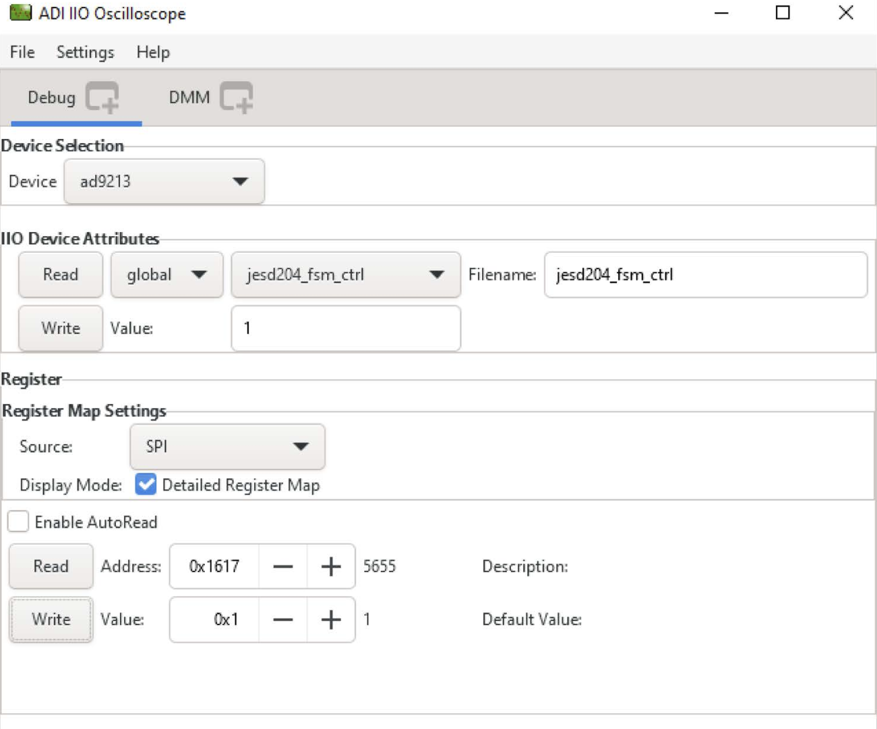 Za ocenjevanje plošče ADMX6001-EBZ in digitalizacijo signalov Analog Devices ponuja grafično uporabniški vmesnik (GUI) orodje IIO Oscilloscope [7] in obsežno knjižnico Python PyADI-IIO [8]. Orodje IIO Oscilloscope je večplatformni GUI za interaktivno spreminjanje nastavitev plošče, zajemanje podatkov in risanje rezultatov. Da bi na primer omogočili AD9213 v DC načinu, bi razvijalci uporabili ploščo orodja IIO Oscilloscope (slika 7) za določitev naprave (v tem primeru AD9213), registra, ki jih zanima (v tem primeru 0x1617), in njegove vrednosti (0x1).