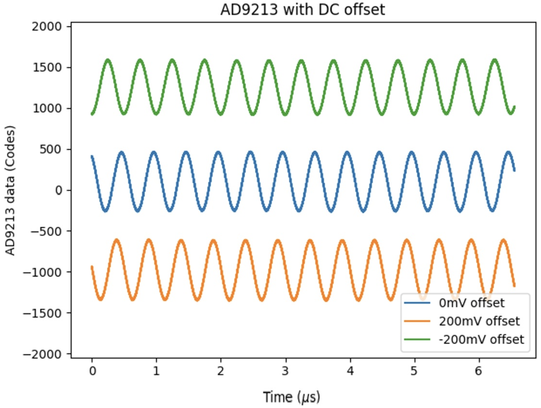 Z risanjem podatkov, zajetih iz istega vhodnega signala pri treh nastavitvah DC offset (0 milivoltov (mV), 200 mV, -200 mV), je prikazana sposobnost plošče ADMX6001-EBZ, da prilagodi vhodno prednapetost za optimizacijo izkoriščanja dinamičnega razpona zelo hitrega ADC (slika 8).