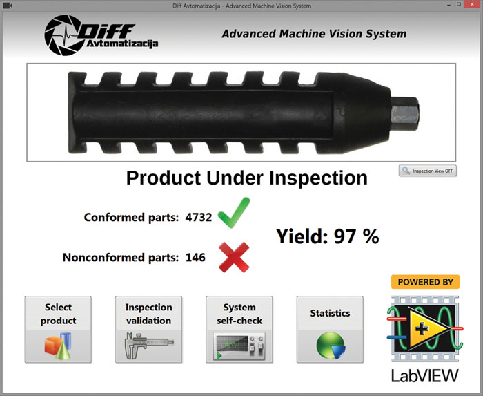 Zaslon na dotik in uporabniški vmesnik po meri v okolju LabVIEW. »Aplikacija za strojni vid v okolju LabVIEW je uspela posneti 64 posnetkov in obdelati vse podatke v 900 ms, kar pomeni, da je za vsako sliko potrebovala približno 14 ms. Aplikacija C++ je potrebovala več kot petkrat več časa (80 ms na sliko) pri enakem času zajema (1 s). Čas zajemanja je sicer v celoti odvisen od nastavitve hitrosti snemanja na kameri, okolje LabVIEW pa je zagotovilo izredno hitro obdelavo podatkov. Poleg tega je bil razvoj v okolju LabVIEW hitrejši kot uporaba jezika C++.«