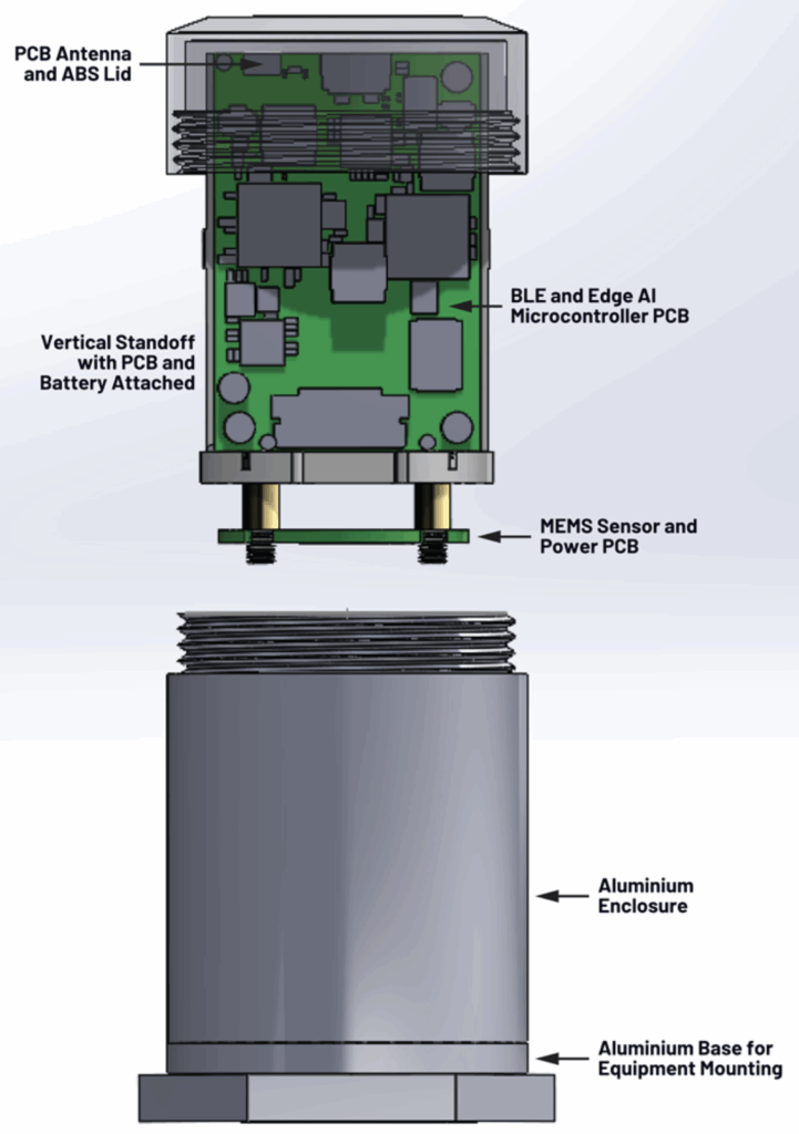 Komplet EV-CBM-VOYAGER4-1Z [2] Voyager 4 podjetja Analog Devices rešuje izzive pri uvajanju brezžičnega CbM z robno umetno inteligenco, saj ponuja popolno platformo za nadzor vibracij na baterijski pogon za stalno preverjanje tehnologije CbM ali takojšnjo uporabo v aplikacijah za prediktivno vzdrževanje. Komplet je zasnovan tako, da prenese zahtevne pogoje, saj uporablja navpični nosilec (slika 1, zgoraj), ki trdno drži glavno tiskano vezje na eni strani in baterijo na drugi. Napajalna plošča in senzorji so nameščeni na dnu nosilca, blizu vira vibracij, ki ga je treba nadzorovati. Za namestitev se vertikalni nosilec namesti v zaščitno aluminijasto ohišje (slika 1, spodaj) s premerom 46 milimetrov (mm) in višino 77 mm. Ohišje je pokrito z akrilnim pokrovom ABS, ki omogoča povezljivost BLE.