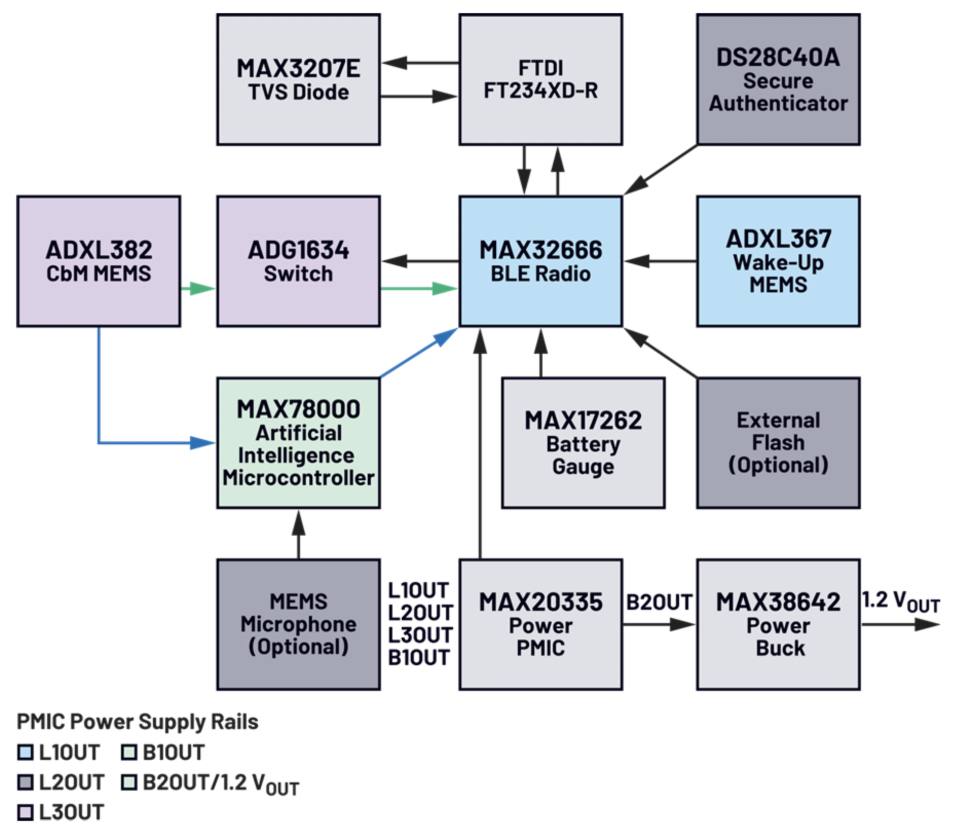 V sistemski zasnovi Voyager 4 se izhod ADXL382 prenese na CMOS stikalo Analog Devices ADG1634BCPZ-REEL7 [6], ki ga nadzira MAX32666 BLE MCU. Kombinacija tega BLE MCU in ultra nizkoenergijskega MEMS pospeškometra ADXL367BCCZ-RL7 [7] podjetja Analog Devices igra osrednjo vlogo v načinih delovanja Voyager 4 (slika 3).