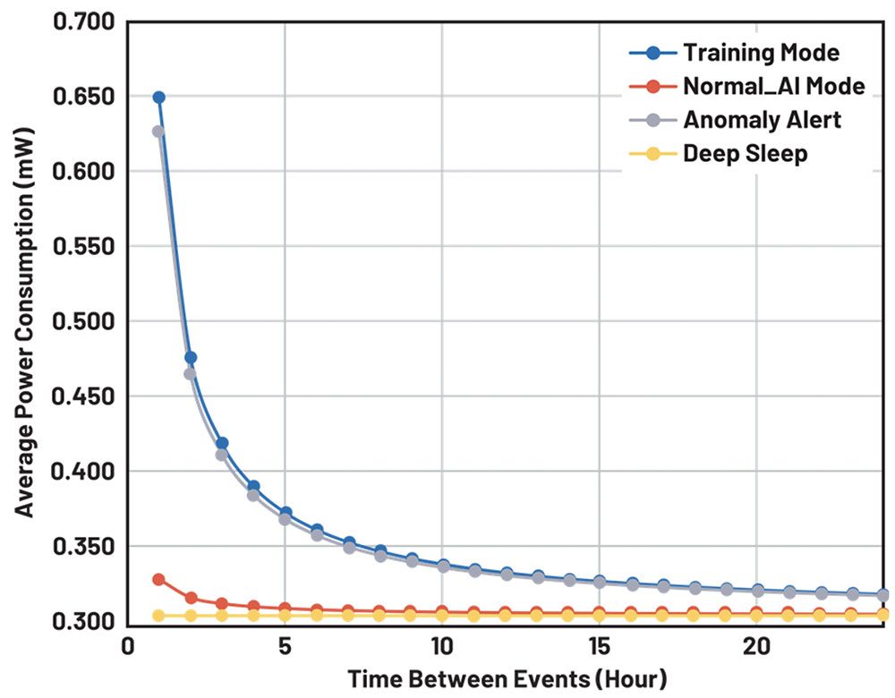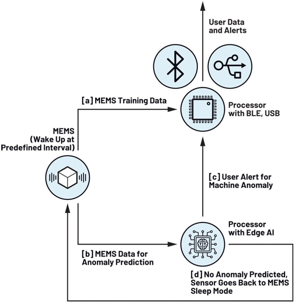 Če ni zaznana nobena anomalija, senzor preide v stanje mirovanja. V tem mirovanju merilnik pospeška ADXL367BCCZ-RL7 porabi le 180 nanoamperov (nA) v načinu prebujanja, ki se aktivira ob gibanju, ko vibracije presežejo nastavljivo mejno vrednost. Ko se aktivira ta način prebujanja, ki ga sproži gibanje, ADXL367BCCZ-RL7 prebudi mikroprocesor MAX32666 BLE, ki začne nov cikel merjenja vibracij in sklepanja. Ta pristop pomaga zmanjšati porabo energije med normalnim delovanjem, saj omeji porabo energije radia BLE na treninge in opozorila o anomalijah (slika 4).
