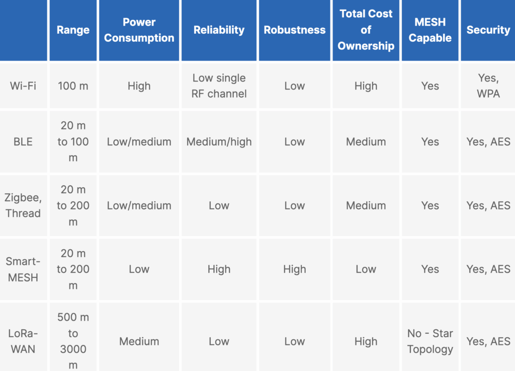 Potreba po zmanjšanju porabe energije postaja vse bolj nujna, saj se CbM vse pogosteje uporablja v rotacijski opremi ali v oddaljeni ali mobilni opremi, kjer žične povezave niso praktične. Pri izpolnjevanju zahtev za brezžično povezljivost v teh primerih Bluetooth Low Energy (BLE) v primerjavi z alternativnimi možnostmi povezljivosti ponuja zahtevano kombinacijo dometa, moči in zanesljivosti (tabela 1).