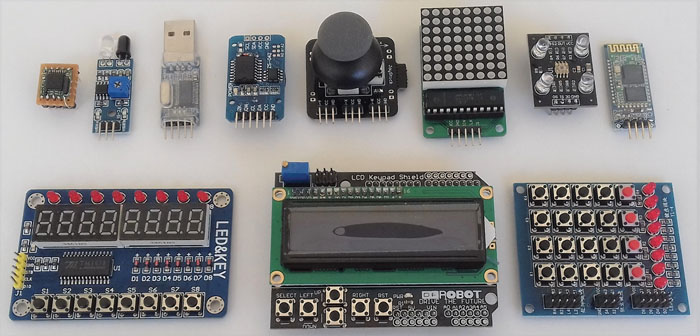 Na sliki 1 je fotografija nekaterih takšnih modulov. Včasih gre samo za stikala ali nekakšen senzor, katerega priključki so pripeljani na priključne konektorje na tiskani ploščici. Včasih pa se na modulih nahajajo sofisticirana integrirana vezja za specifične namene, s katerimi je potrebno znati komunicirati. Čeprav imajo vsi zelo različne namene, jim je skupna ena stvar in naj jo poudarimo takoj: “Arduino kompatibilen modul” je samo marketinški trik, ki bo uporabnika Arduino platforme pritegnila, da ga pogleda in seveda kupi nekatere od ponujenih modulov. Seveda so te moduli uporabni tudi na vseh naših platformah, od najmanjše MikroPin do največje MegaPin plošče, ker tako Arduino kot Pini uporabljajo mikrokontrolerje iz AVR družine.