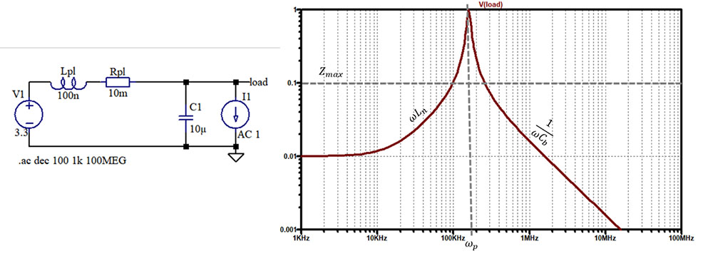 Kako bi izgledala, si poglejmo kar v LTspice simulaciji na sliki 10. Vidimo, da ob dodatku idealnega blokirnega kondenzatorja vzporedno s induktivnostjo napajanja z zelo nizko serijsko upornostjo nastane kvaliteten paralelni nihajni krog z zelo izrazito paralelno resonanco, ki izdatno presega zadano maksimalno vrednost impedance napajanja.