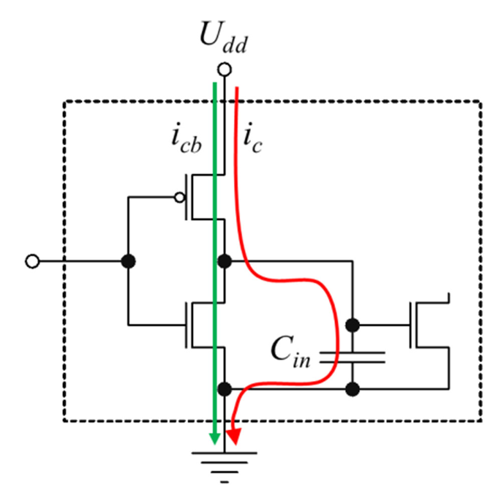 Posamezni tranzistorji ob preklopih polnijo in praznijo kapacitivnosti sosednjih tranzistorjev, kamor so povezani (rdeča puščica na sliki 2). Poleg tega pa lahko v času preklopa steče zelo na kratko tok prek obeh tranzistorjev (zelena puščica na sliki 2.)
