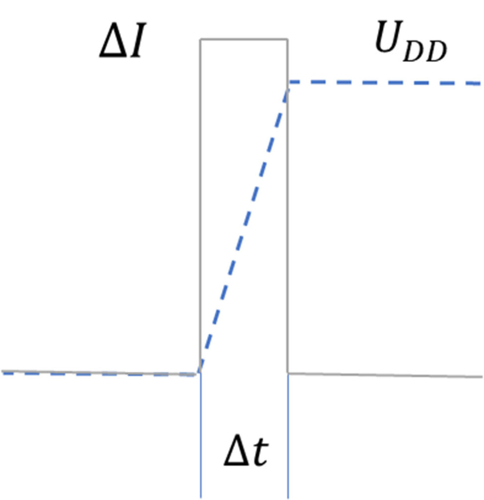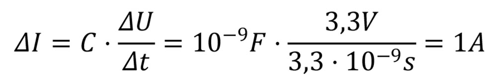 Poglejmo si, kakšne napajalne tokovne sunke lahko sploh pričakujemo. Privzemimo nek fiktivni primer čipa, ki teče na frekvenci 100 MHz na napajalni napetosti 3,3 V in se omejimo zgolj na tok polnjenja kondenzatorjev. V enem samem preklopu, ki npr. traja Δt=3,3ns se mora tako za ΔU=3,3V napolniti na milijone vrat MOSFET-ov s skupno kapacitivnostjo npr. C=1nF, kar nam da tokovne sunke F1.