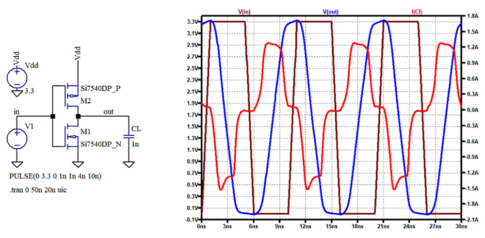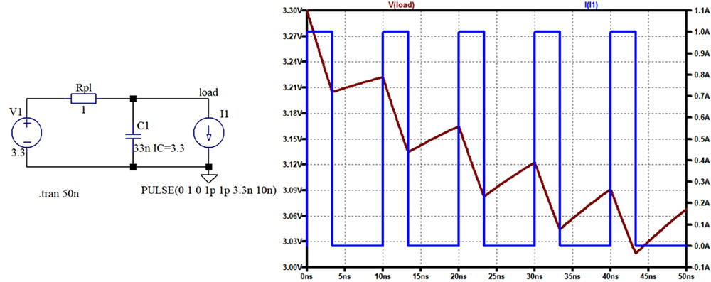 LT spice simulacija na sliki 5 tega fiktivnega primera kaže podobne rezultate, kjer ob vsakem tokovnem impulzu pade napetost na blokirnem kondenzatorju za približno 100 mV. Vendar pa smo v sami enačbi zanemarili polnjenje kondenzatorja, kar pa smo lahko v sami simulaciji brez težav dodali in sicer se blokirni kondenzator s strani napajalnika polni prek upornosti povezovalne linije, kar se vidi kot povečanje napajalne napetost v času, ko tok ne teče.