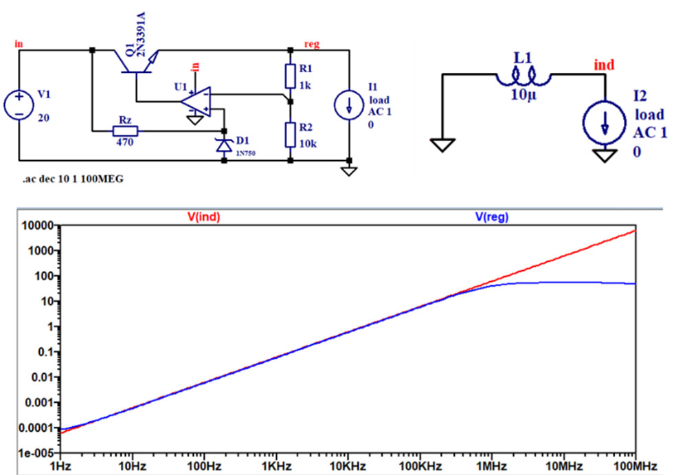 Kakšna pa je pričakovana impedanca napajanja v vezjih? V vezjih za generacijo napajalne napetosti običajno nimamo na voljo kar cele množice raznih baterij, temveč uporabljamo napetostne regulatorje, ki iz enega napajalnega vira generirajo želene napetosti. Vzemimo najbolj enostaven primer napetostnega regulatorja, ki je prikazan na sliki 6 levo. Deluje tako, da napetost izhoda prek povratne vezave primerja z referenco in s tem signalom krmili močnostni tranzistor. Ko se napajalni tok poveča, napetost rahlo pade, kar prek negativne povratne vezave odpre tranzistor. Pri nizkih frekvencah ta povratna vezava deluje dovolj hitro, da uspe stabilizirati izhodno napetost. Ko pa se frekvenca napajalnega toka poveča, pa povratna vezava pa začne fazno zaostajati, kar posledično povzroči povečano izmenično komponento izhodne napetosti. Če pogledamo posledično impedanco, vidimo, da ta s frekvenco raste, kar pomeni, da ima induktivni značaj in se lepo prilega impedanci tuljave z induktivnostjo 10 µH (slika 6 desno).