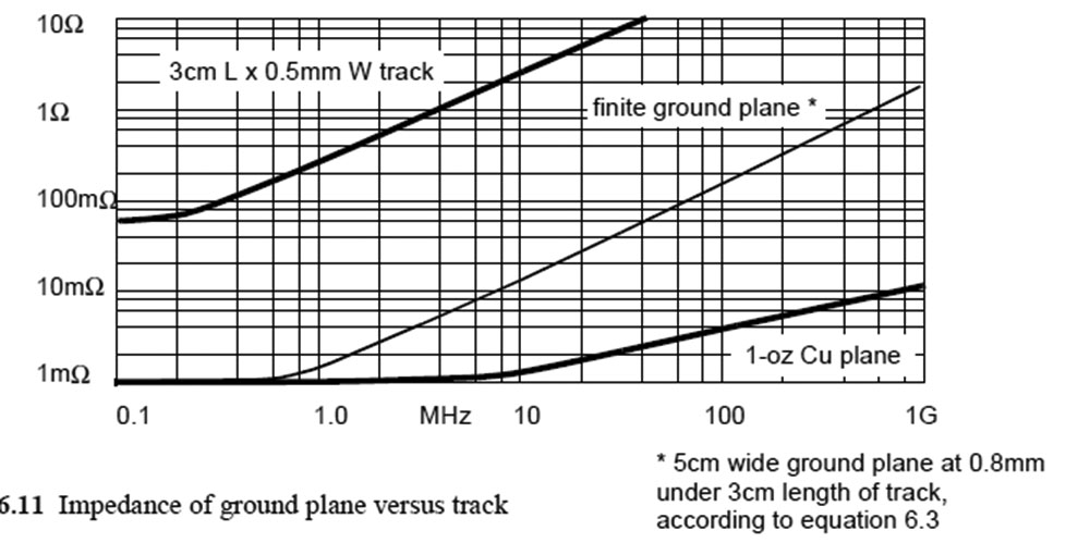 Slika 7 prikazuje potek impedance linije dolžine 3 cm in širine 0,5 mm v primerjavi s 5×5 cm veliko površino mase in neskončno površino mase. Vsi trije primeri kažejo uporovni značaj pri nizkih frekvencah, kjer pa hitro z višanjem frekvence prevlada induktivni značaj. Omenjena linija ustreza vrednosti nekje 6 nH/cm, medtem ko imajo velike površine mase impedanco za več razredov velikosti nižje. Impedanco napajalnih virov v vezjih torej modeliramo kot zaporedno vezane upornost in induktivnost vira in povezave na tiskanem vezju, kot kaže slika 8. Kako pa upoštevati to impedanco napetostnega vira pri dimenzioniranju blokirnega kondenzatorja?