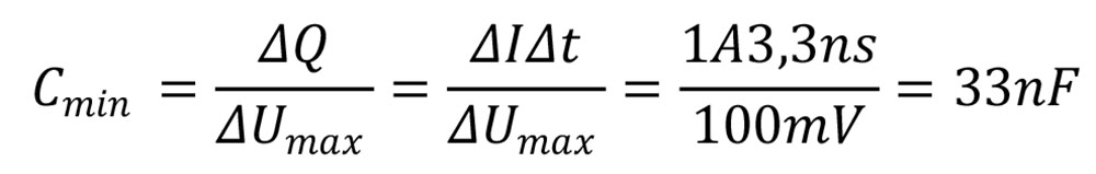 Seveda nas sedaj zanima, kolikšna je minimalna vrednost blokirnega kondenzatorja Cmin, ki bo pri takih tokovnih sunkih lahko zagotavljal stabilno napajanje. Pri tem privzemimo, da kondenzator znotraj časa Δt dovaja s konstantnimi tokovnimi impulzi ΔI ves potreben naboj čipu in da je dovoljen padec napetosti na blokirnem kondenzatorju znotraj enega cikla ΔUmax=100mV, F2.
