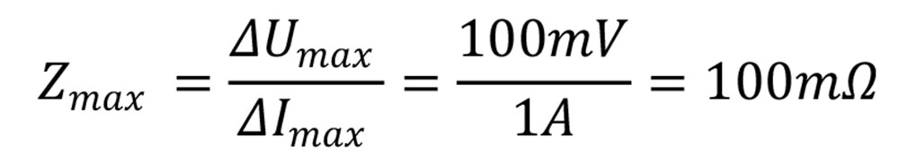 V osnovi želimo zagotoviti impedanco dovolj nizko v dovolj širokem frekvenčnem področju, kar dosežemo z blokirnim kondenzatorjem, kateremu impedanca pada z višanjem frekvence. Kolikšna pa naj bi bila maksimalna impedanca napajalnega vezja, pri katerem bi čip še nemoteno delal? Približno jo lahko določimo tako, da delimo maksimalno dovoljeno nihanje napetost z amplitudo tokovnih sunkov, ki jih v napajanju povzroča čip F3.
