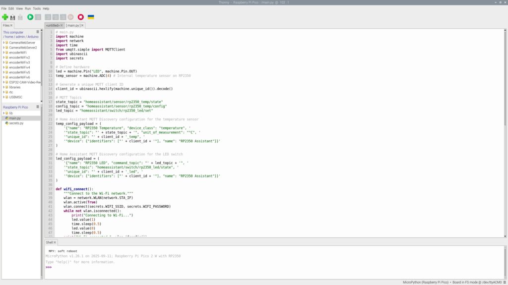 Če se gradnje naprave lotevamo na osnovi Raspberry Pi Pico ali Pico 2, oziroma RP2040 ali RP2350 mikrokontrolerja, si lahko pomagamo z razvojnim okoljem Thonny, v katerega prenesemo kodo enega od številnih primerov iz GitHuba, na primer: github.com/jramsgz/pico-w-home-assistant. Predpogoj je, da prej v RP2040 ali RP2350 naložimo uf2 datoteko z MikroPythonom, kar omogoča povezavo Raspberry Pi Pico ali Pico 2 z razvojnim okoljem.
